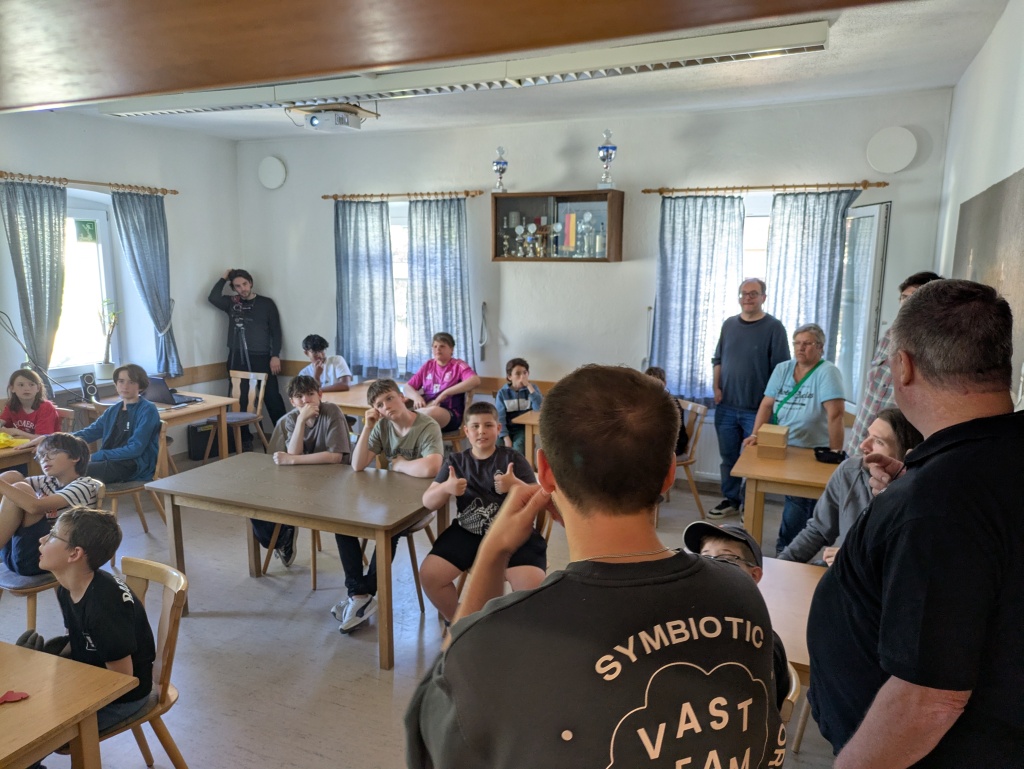 Auf dem Foto sieht man Übungsleiter Roland Mayer mit dem französischen Trainer, wie sie gerade verschiedene Endspielstellungen, wie die Philidor-Stellung, unseren und den französischen Jugendlichen erklären.