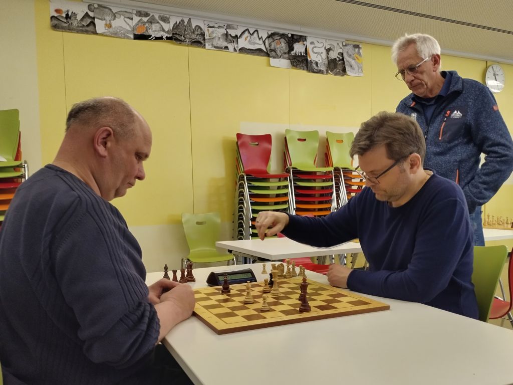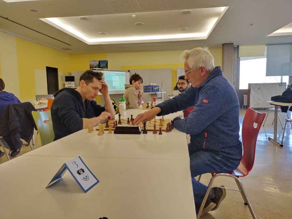 Bernhard und Sören hatten Startnummern erwischt, mit denen sie einträchtig nebeneinander durchs Turnier rutschten, hier in Runde 8 nach der ersten Pause. Sören war bis dahin nach zwei Niederlagen auf Platz 10 zurückgefallen und ließ hier ein Remis gegen FM Namyslo folgen. Die insgesamt 3,5 Punkte im zweiten Drittel brachten eine leichte Verbesserung auf Platz 9. Ich ließ meinen beiden Punkten aus dem ersten Drittel immerhin 2,5 weitere folgen, trotzdem rutschte ich vom 16. auf den 18. Platz ab. Bernhard holte in Runde 12 gegen mich sein erstes Remis und gerade noch vor der zweiten Pause endlich seinen ersten Sieg, gegen Egor Shamarin: