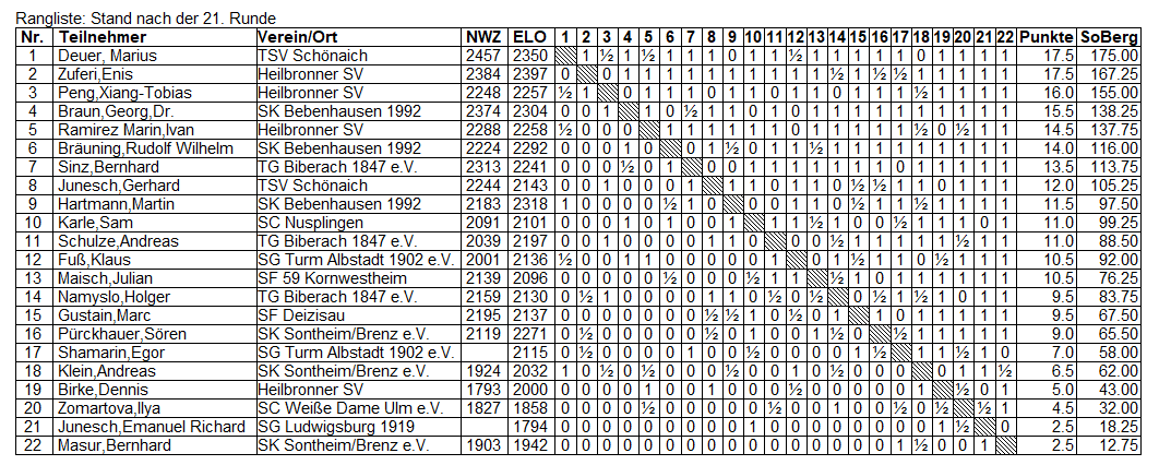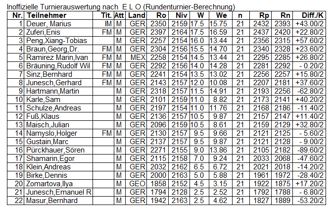 Eine Vorentscheidung im Kampf um den zweiten Platz fiel in Runde 16 beim Sieg von FM Zuferi gegen FM Bräuning, die zu diesem Zeitpunkt beide je einen Punkt hinter Deuer lagen: